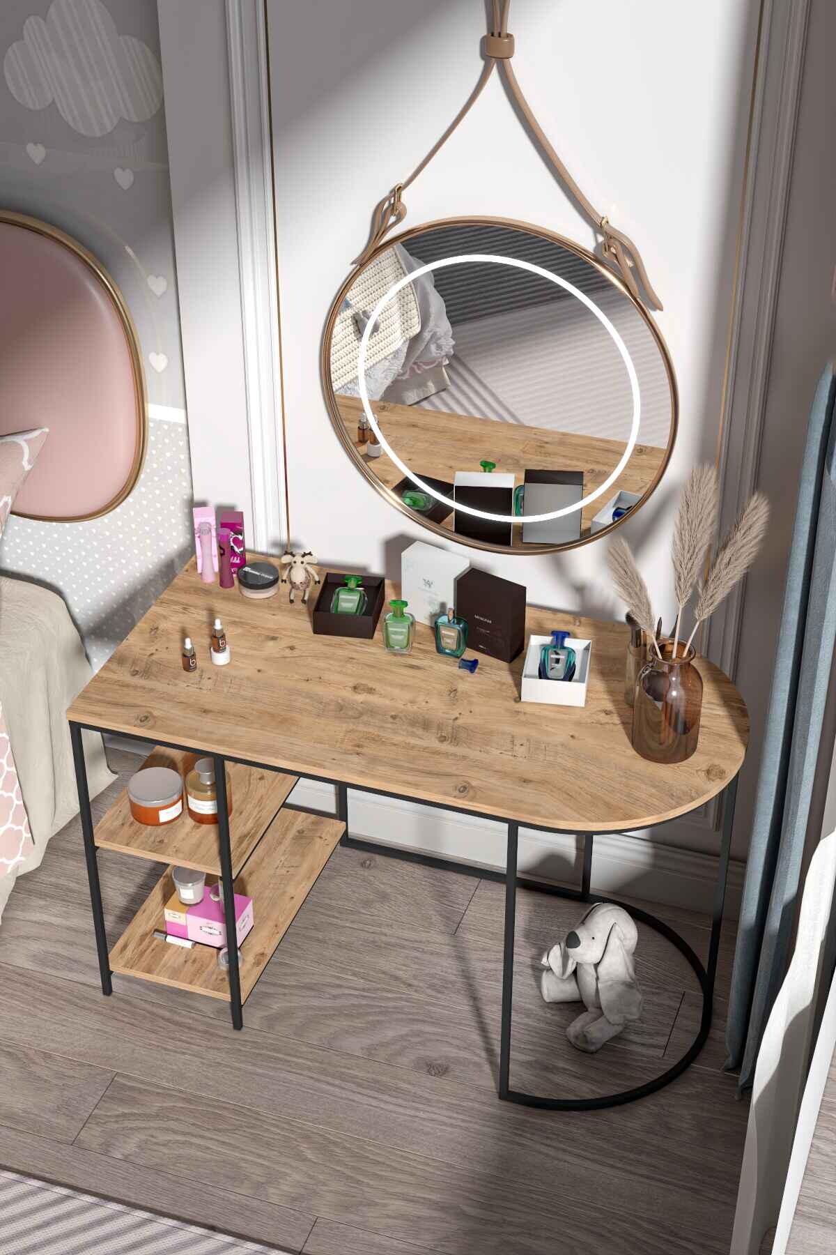 Yan tarafında yer alan 2 adet raf bölmesi, ekstra depolama alanı sunarak eşyalarınızı düzenli tutmanıza yardımcı olur. Raflar; kozmetik ürünleri, kitaplar, defterler ya da dekoratif objeler için son derece kullanışlıdır.