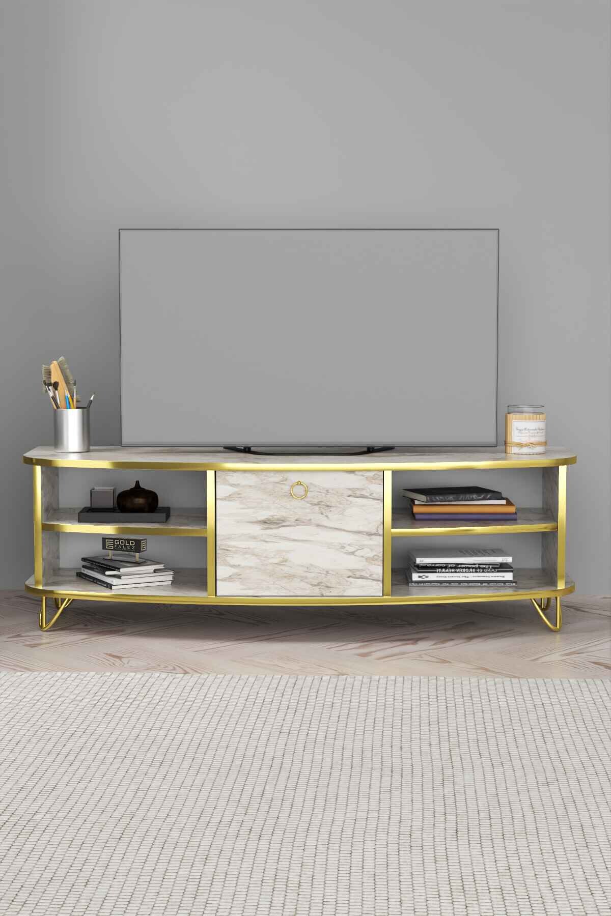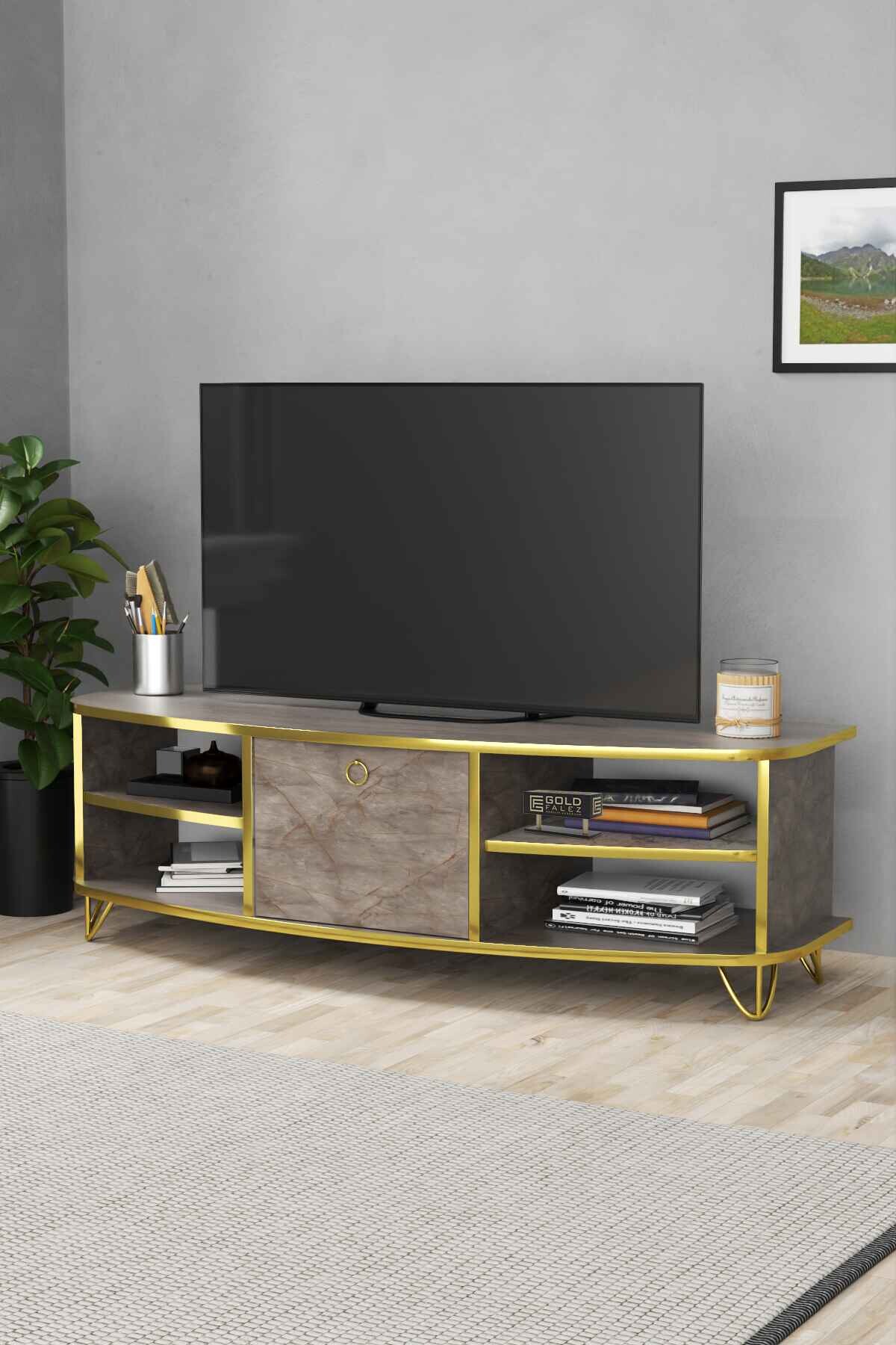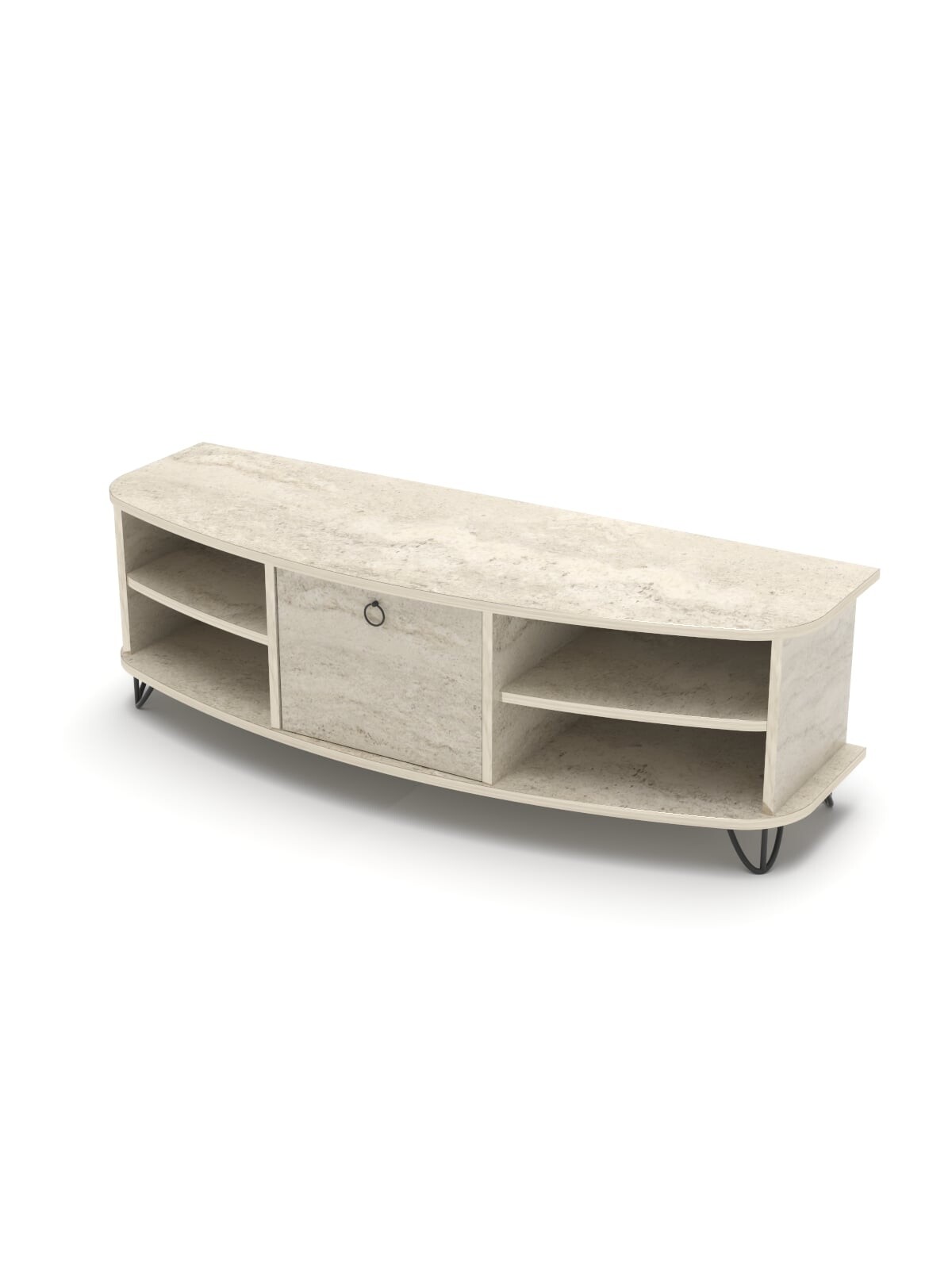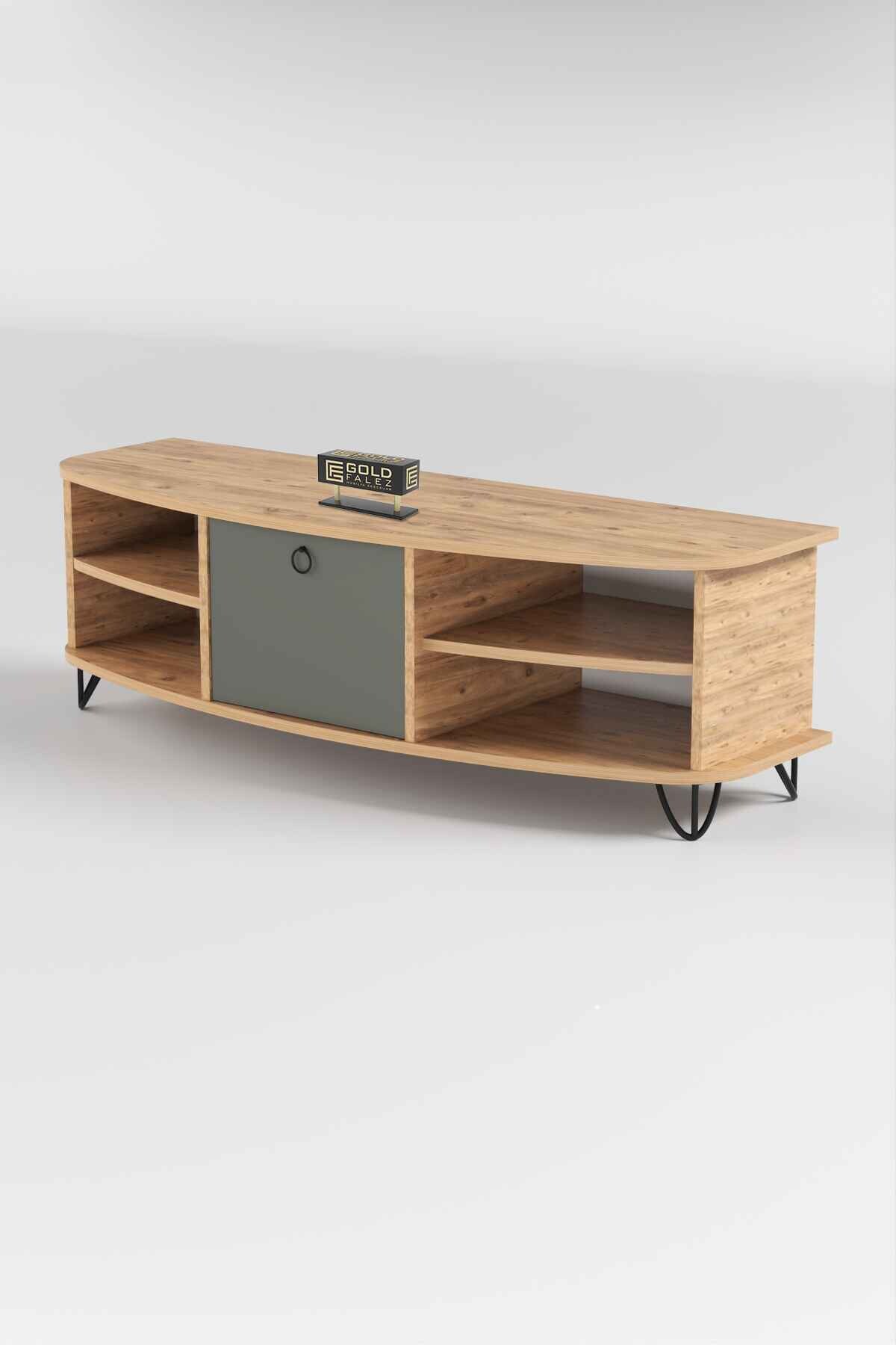 The wide top table provides an ideal usage area for televisions of various sizes, while the shelves with doors in the lower section offer a practical storage solution for satellite receivers, books, decorative objects and other electronic devices.