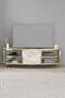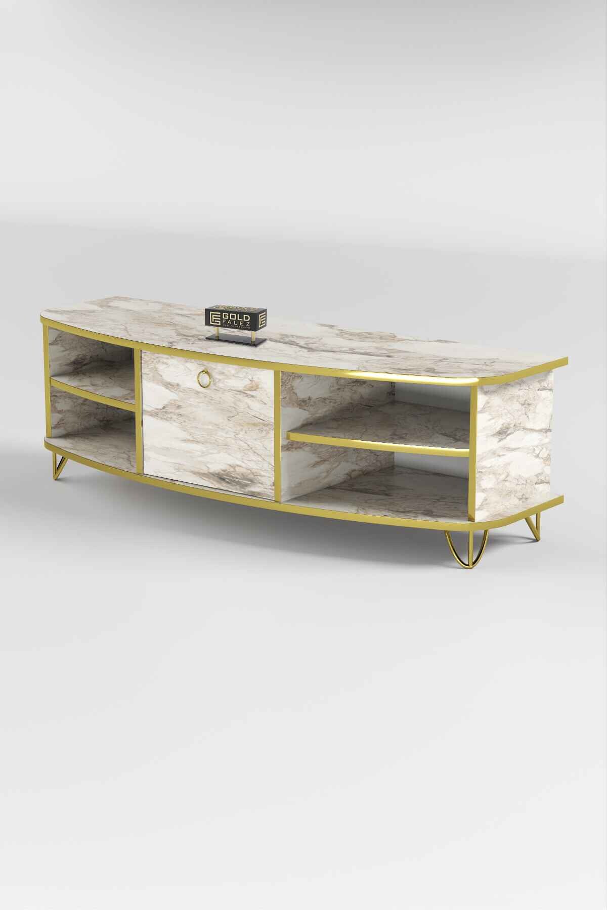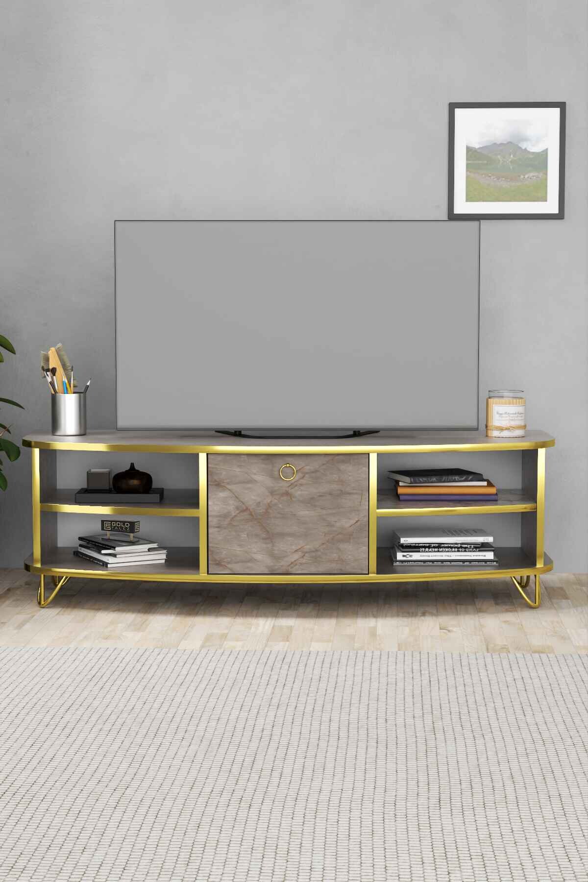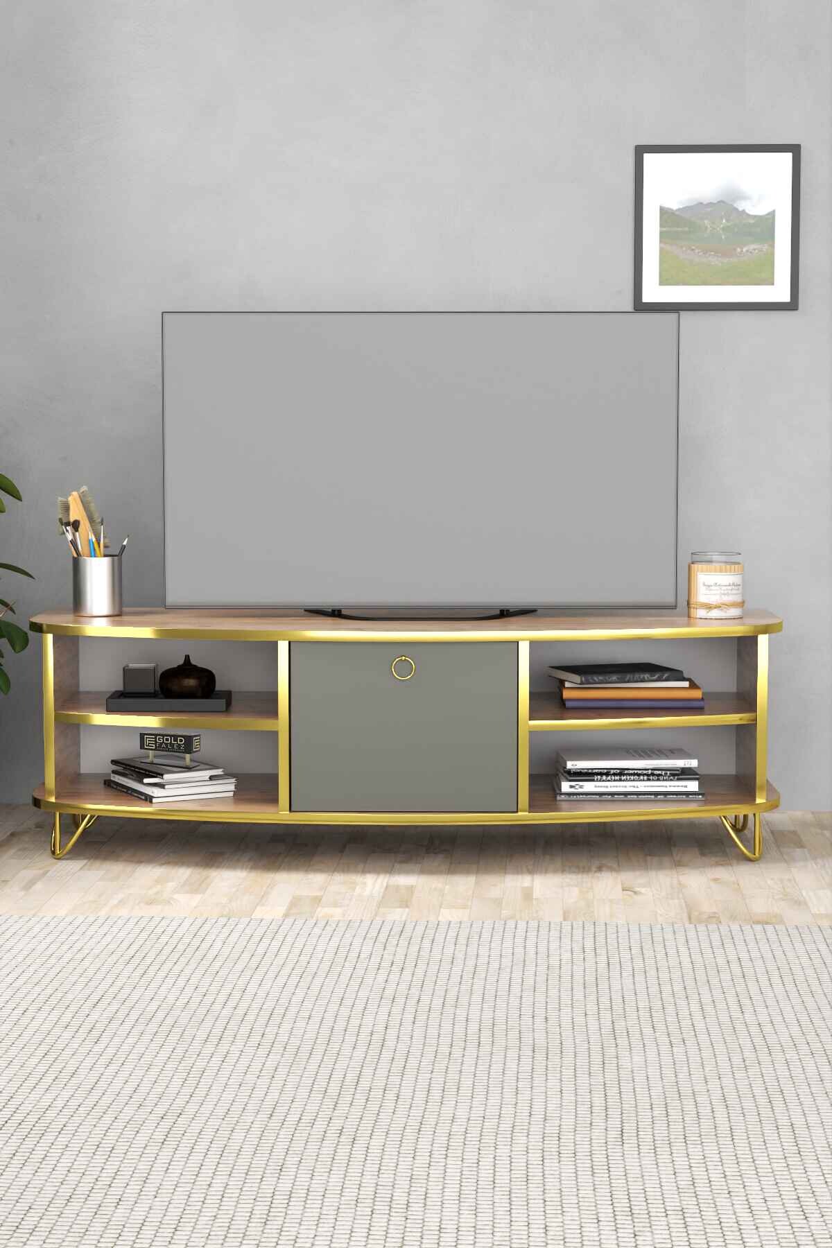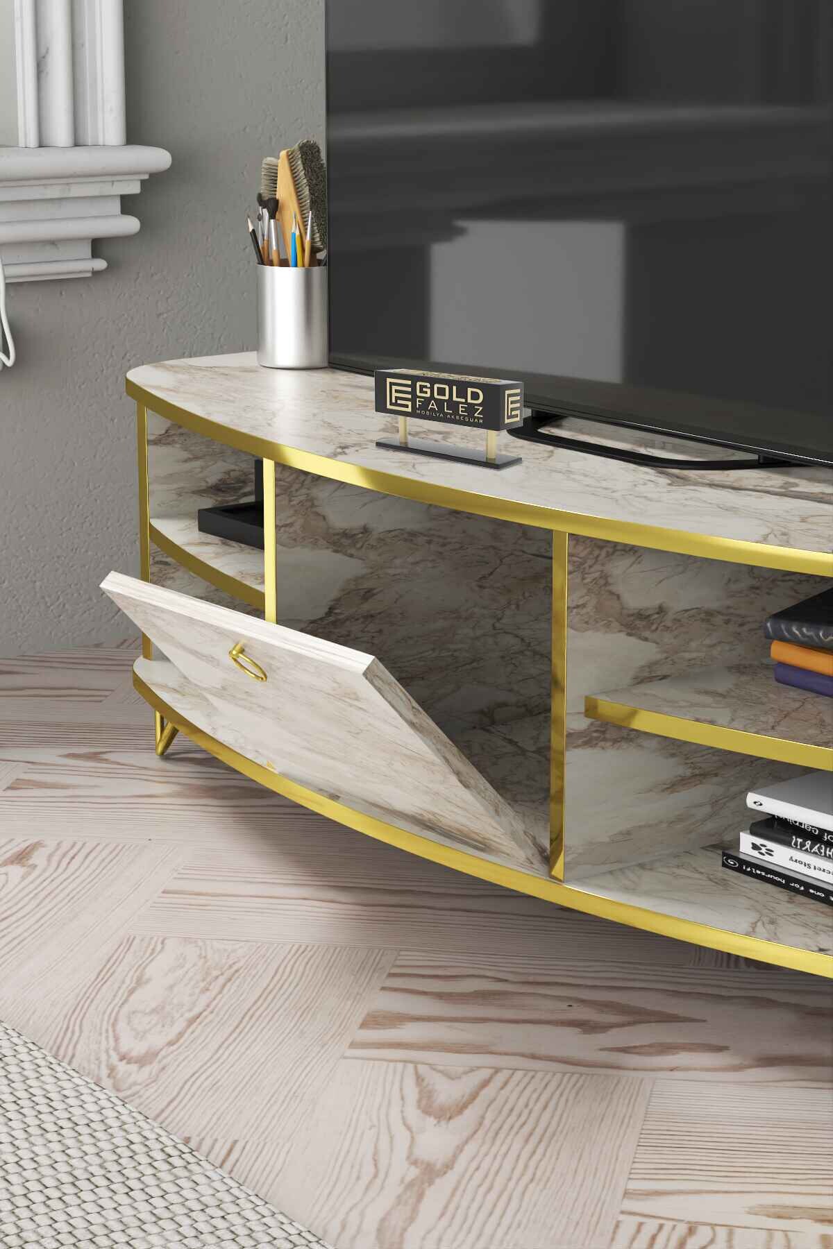The wide top table provides an ideal usage area for televisions of various sizes, while the shelves with doors in the lower section offer a practical storage solution for satellite receivers, books, decorative objects and other electronic devices.