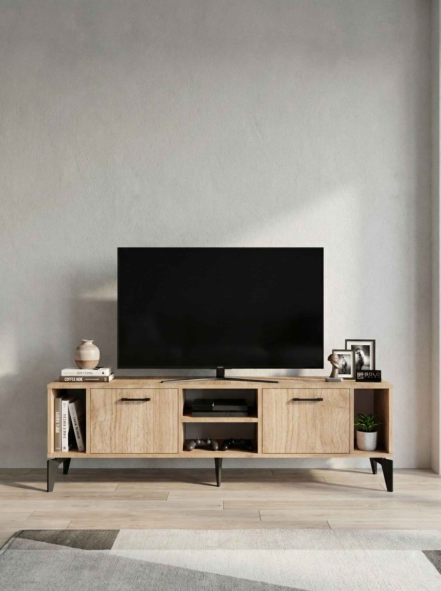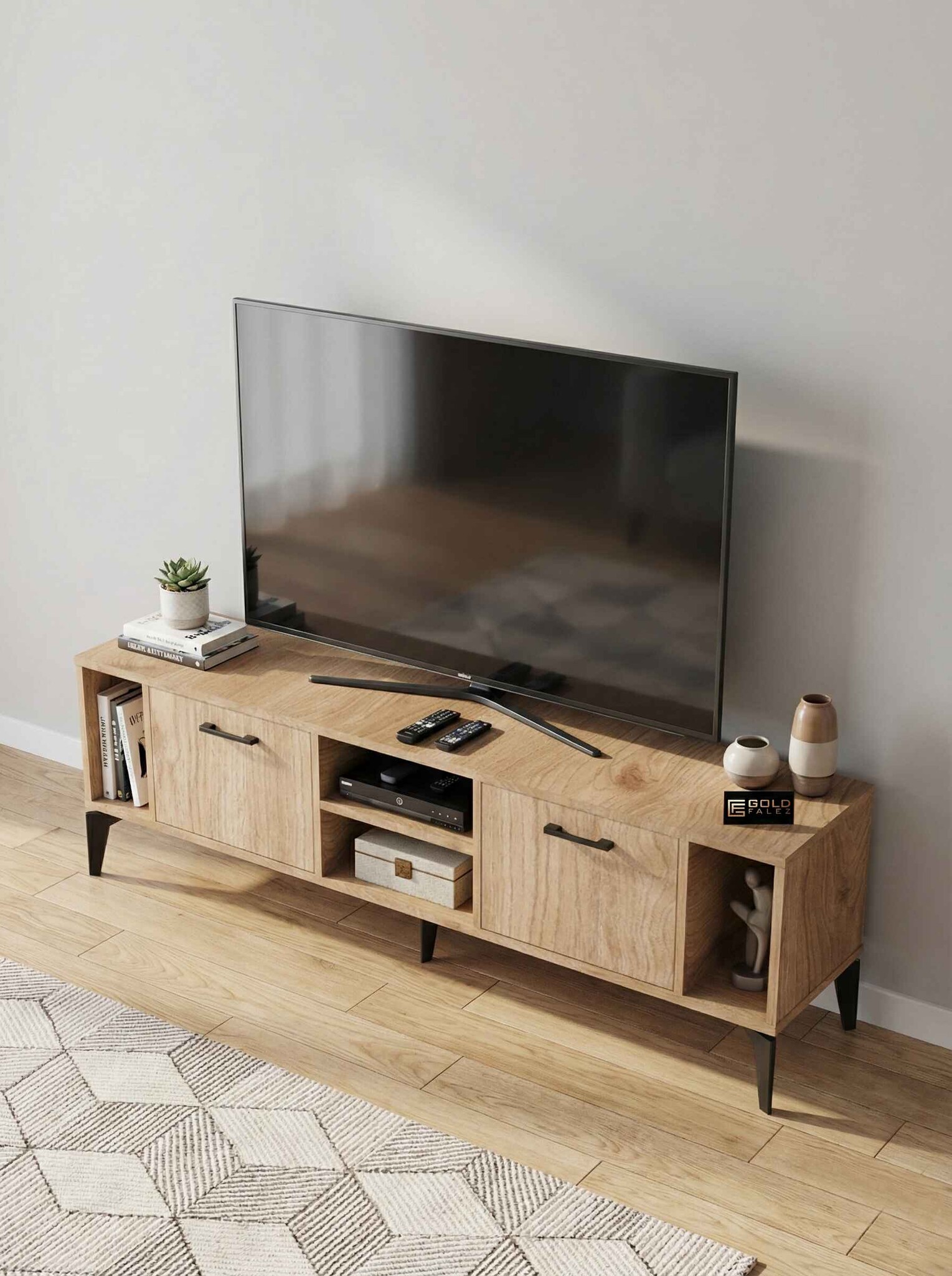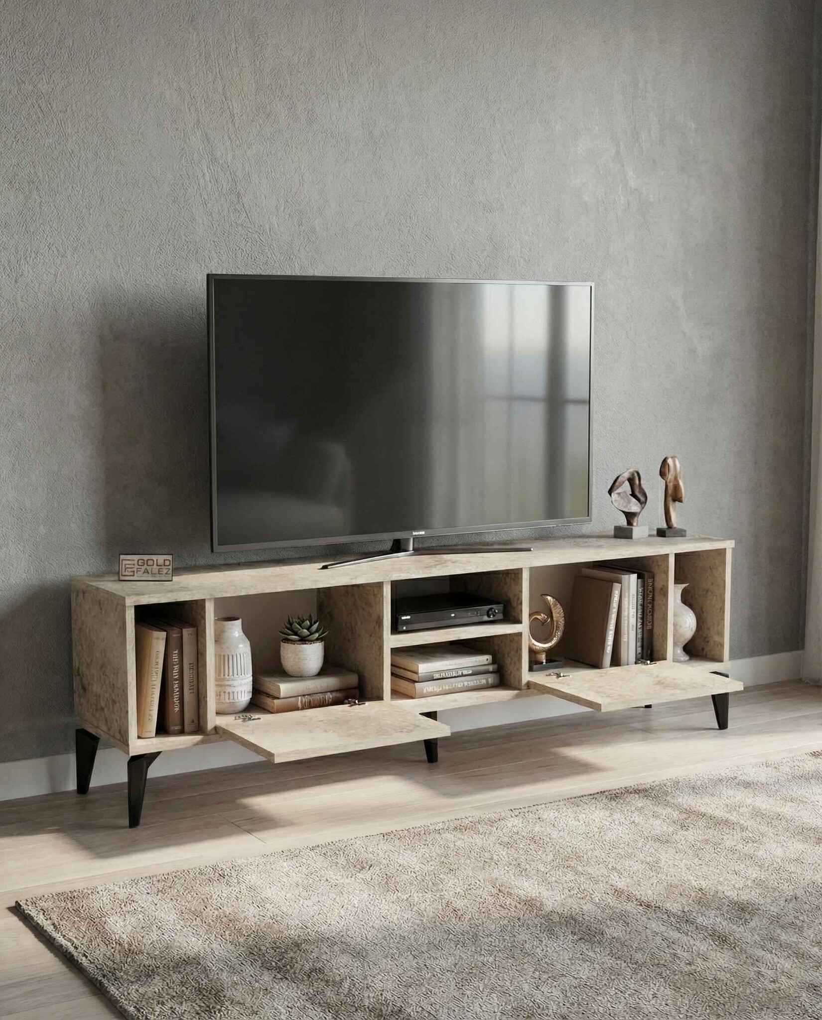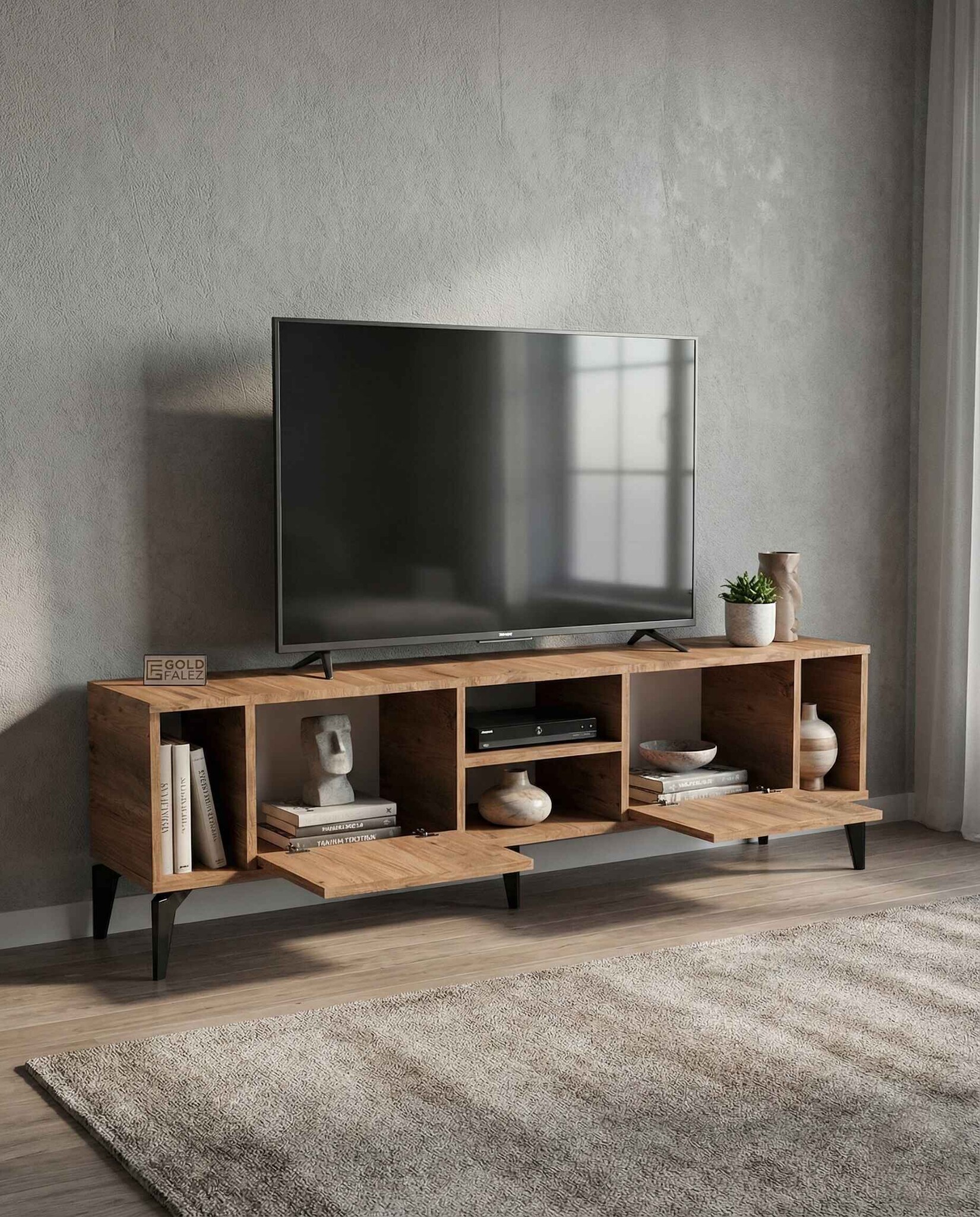 Geniş üst tabla, çeşitli boyutlardaki televizyonlar için ideal bir kullanım alanı sağlarken alt bölümde yer kapaklı raflar ise uydu alıcısı, kitap, dekoratif obje ve diğer elektronik cihazlar için pratik bir depolama çözümü sunar.