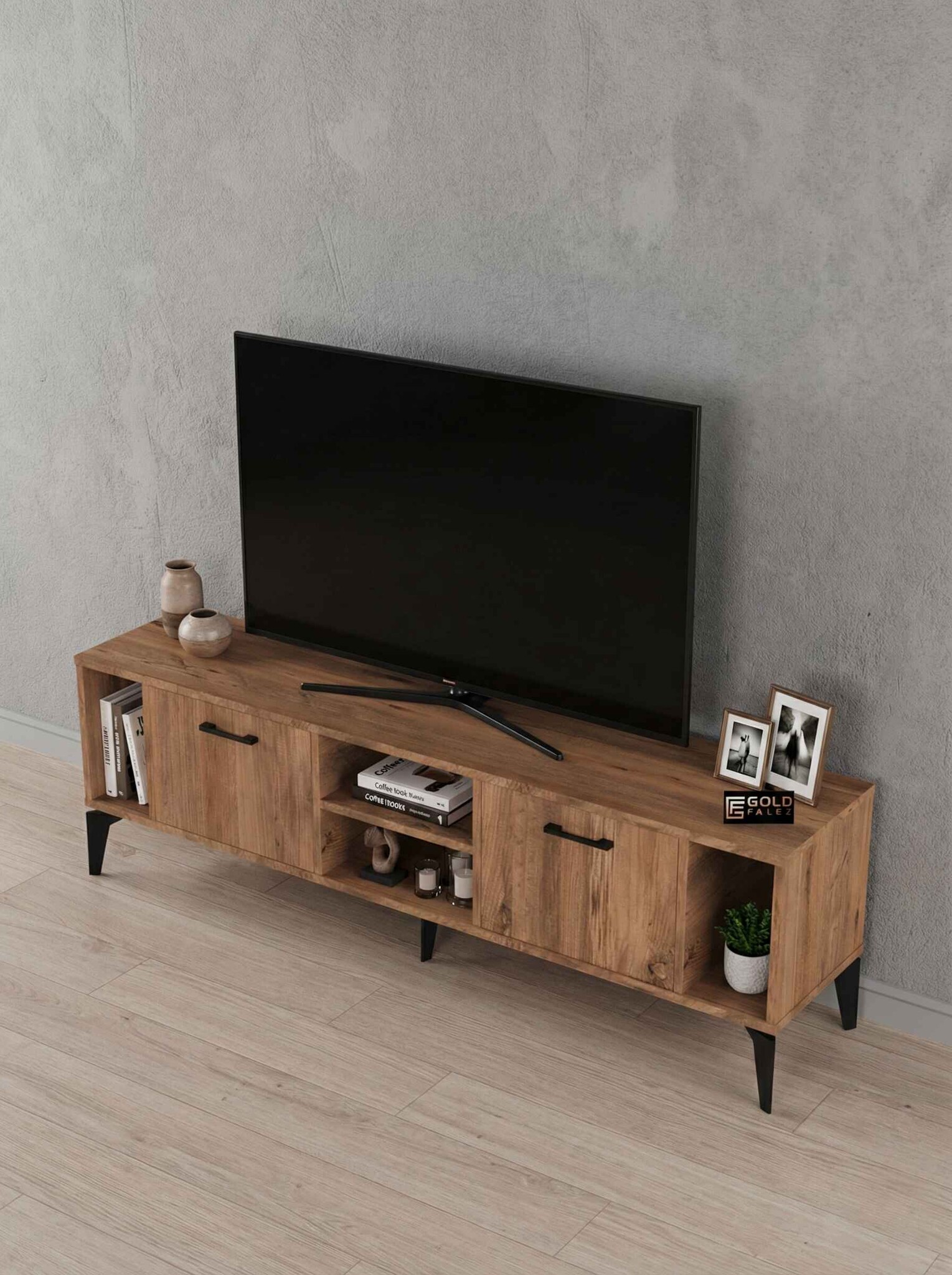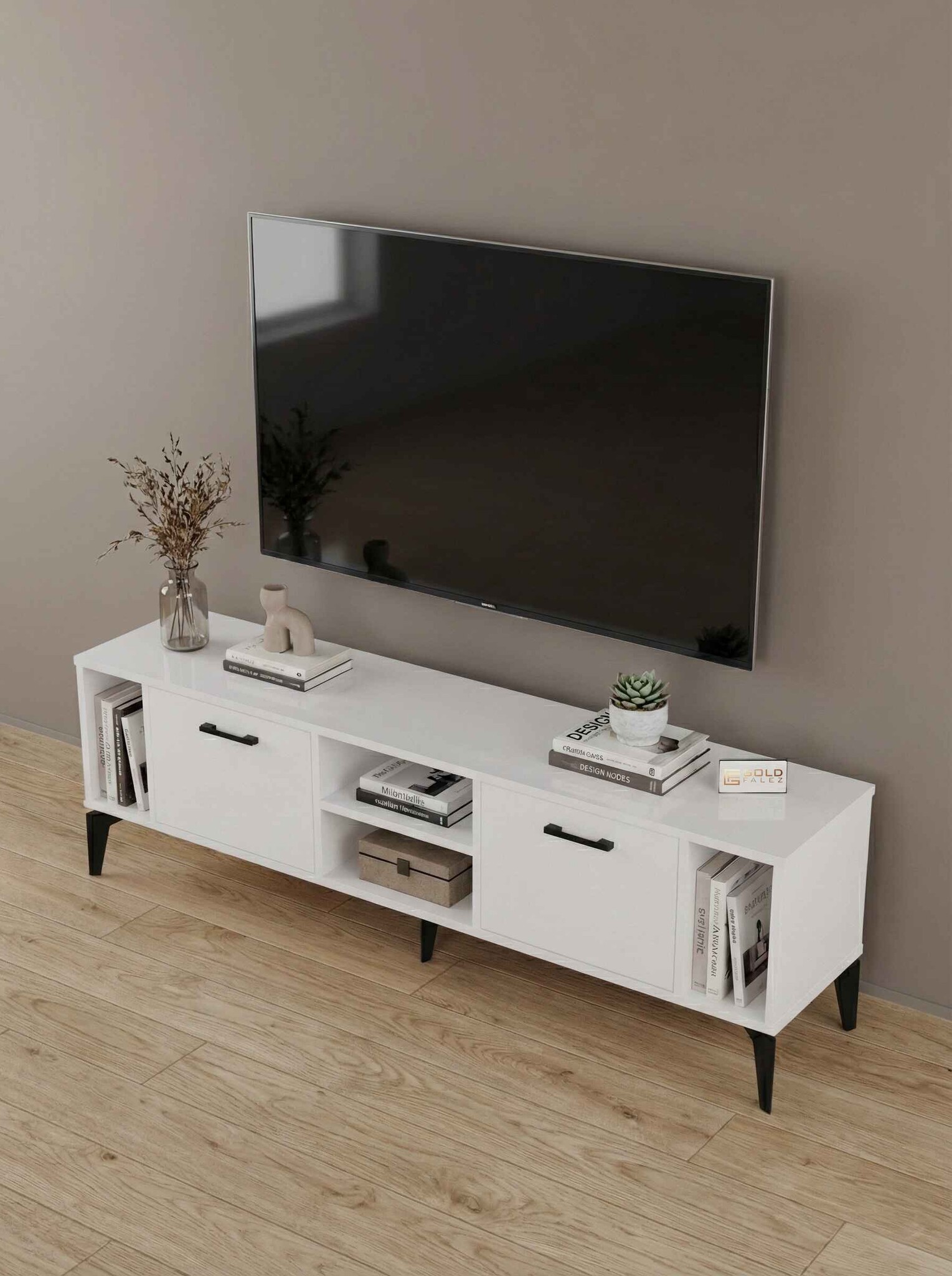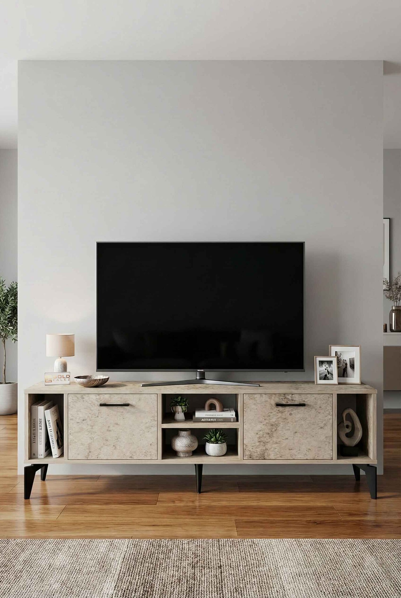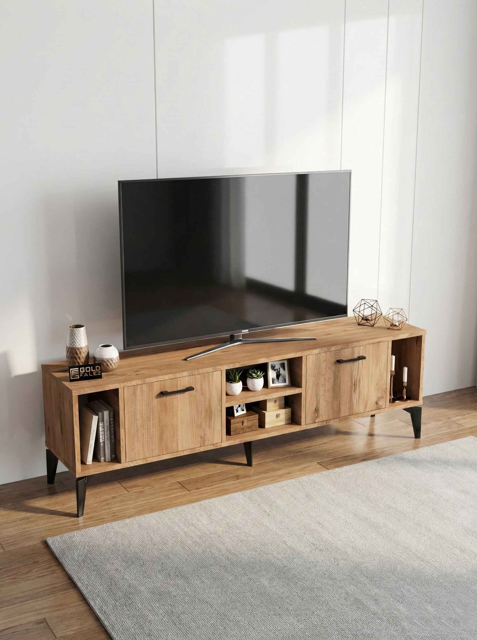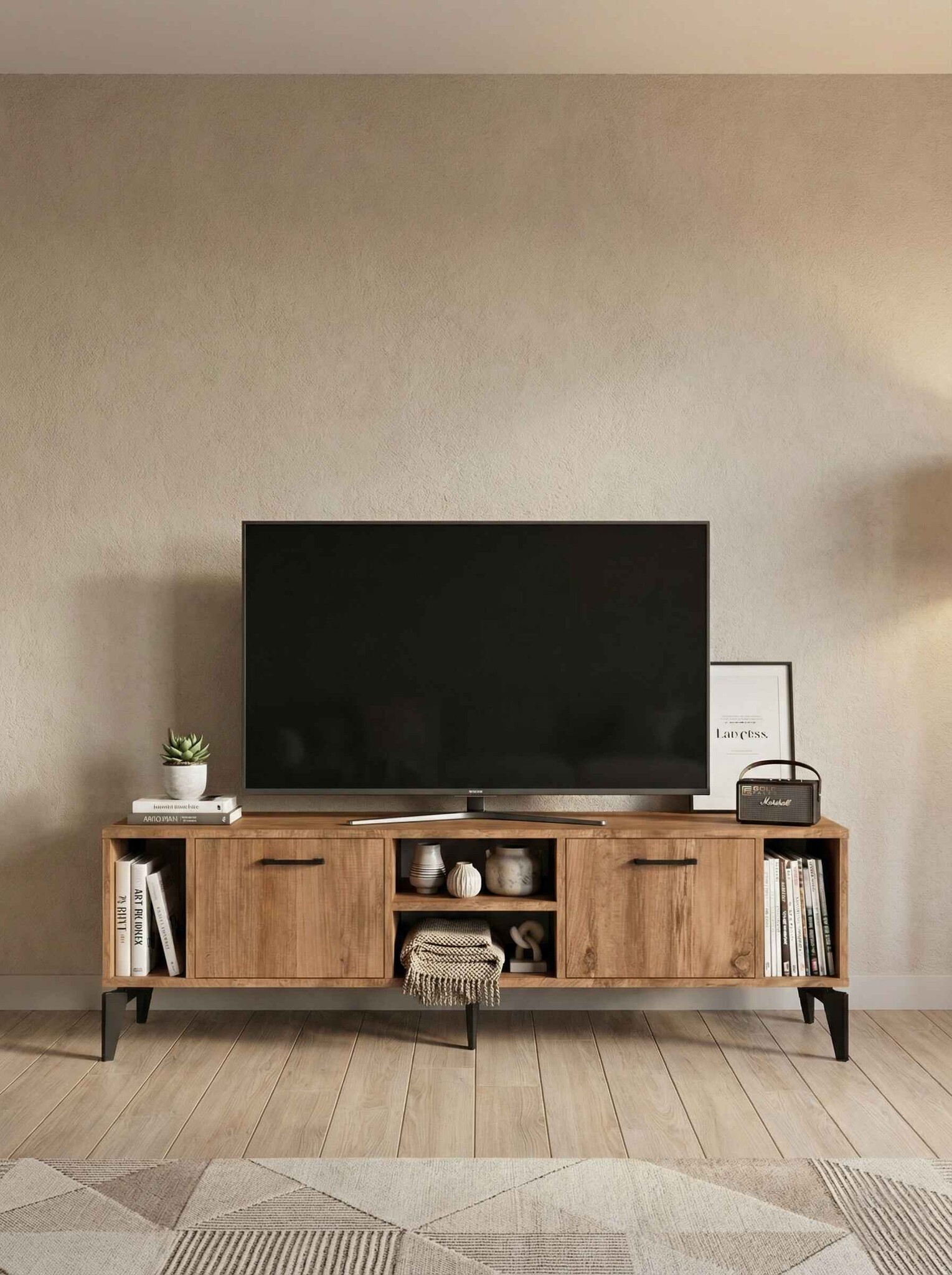 Geniş üst tabla, çeşitli boyutlardaki televizyonlar için ideal bir kullanım alanı sağlarken alt bölümde yer kapaklı raflar ise uydu alıcısı, kitap, dekoratif obje ve diğer elektronik cihazlar için pratik bir depolama çözümü sunar.