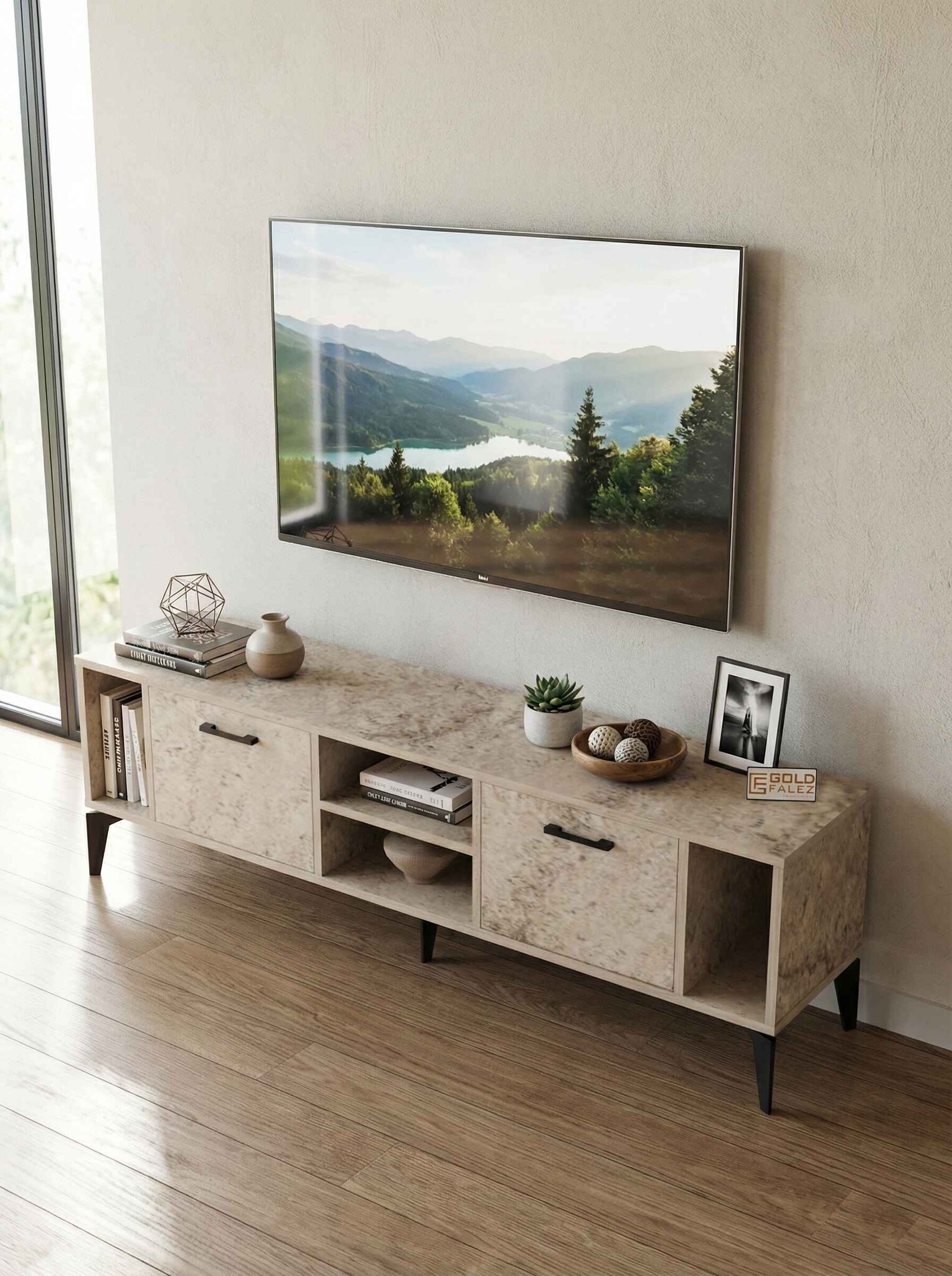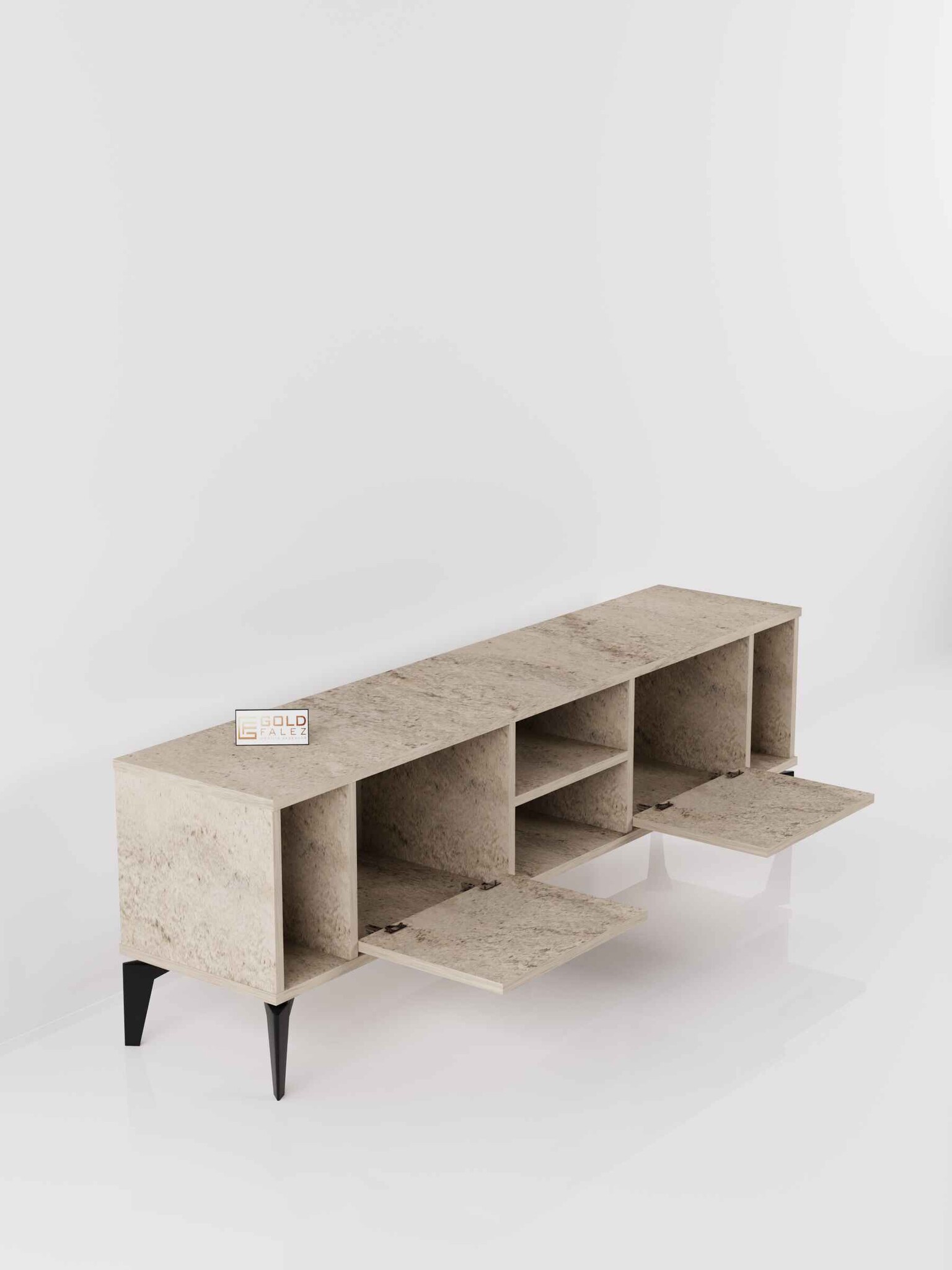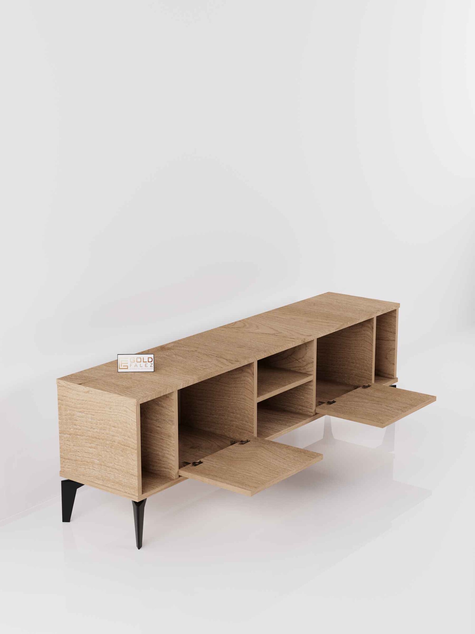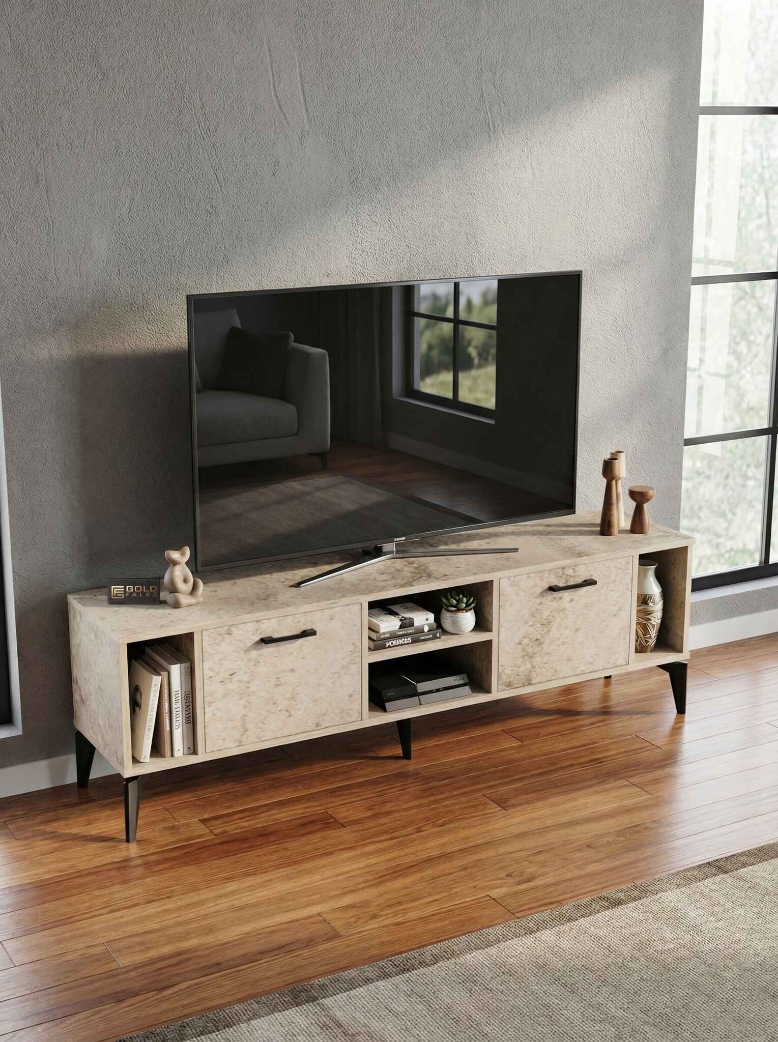 Geniş üst tabla, çeşitli boyutlardaki televizyonlar için ideal bir kullanım alanı sağlarken alt bölümde yer kapaklı raflar ise uydu alıcısı, kitap, dekoratif obje ve diğer elektronik cihazlar için pratik bir depolama çözümü sunar.