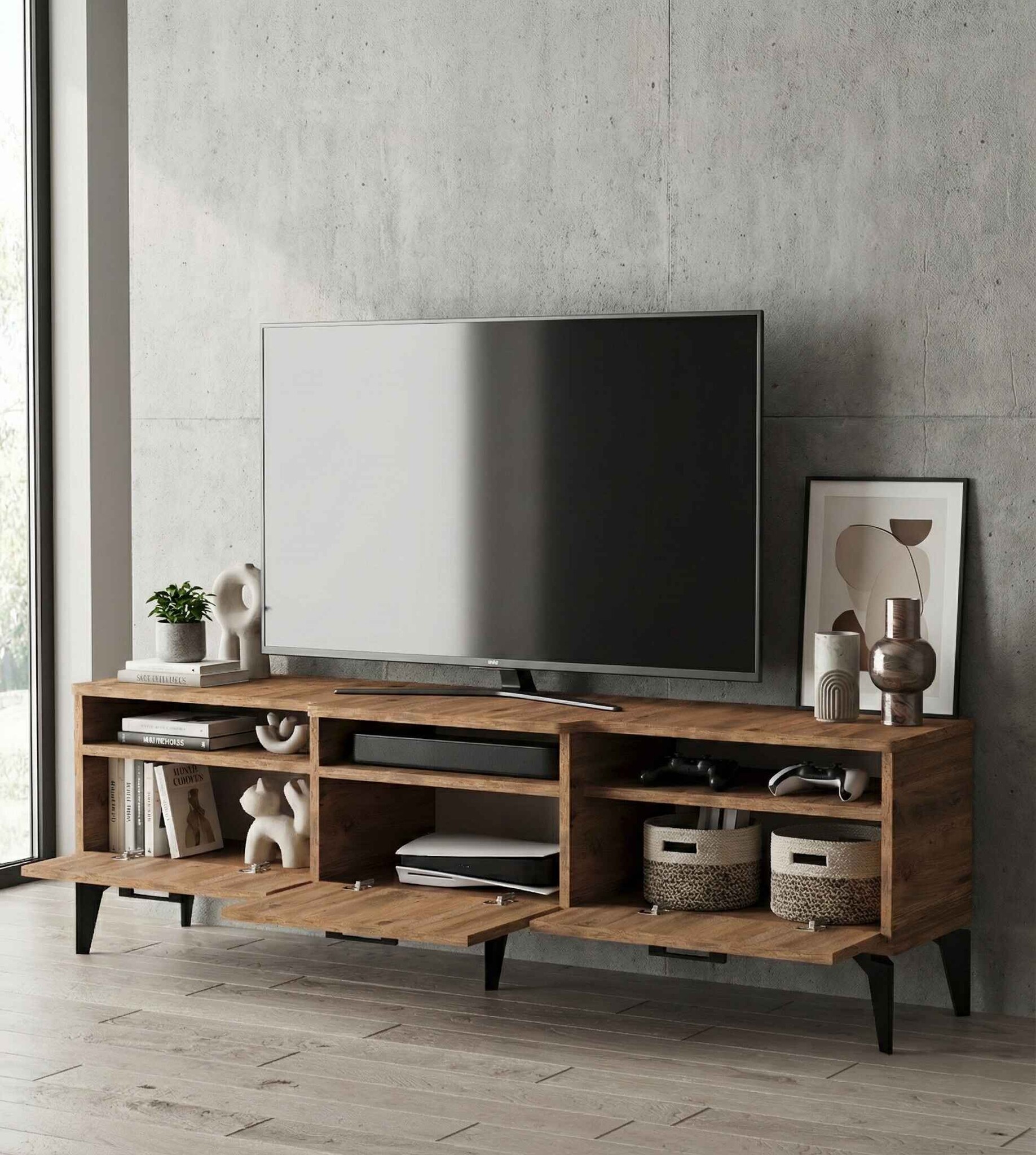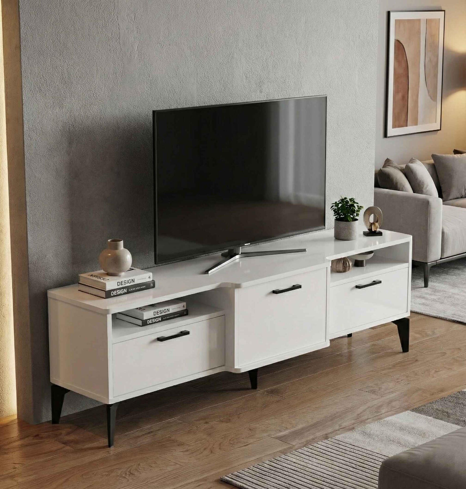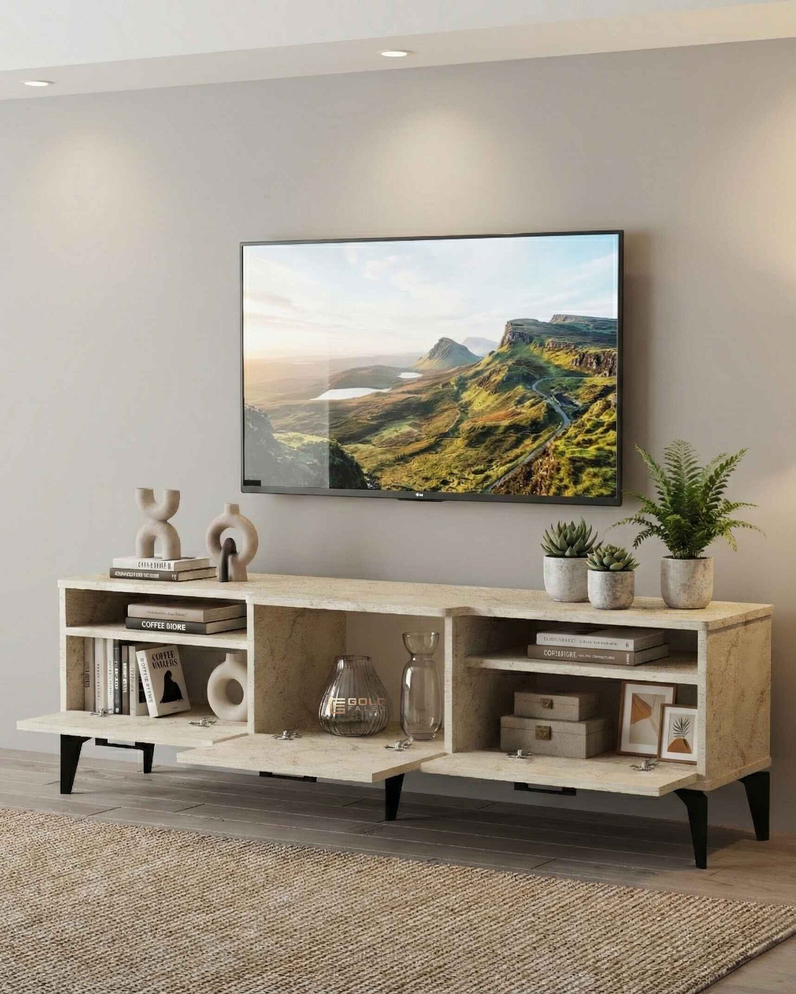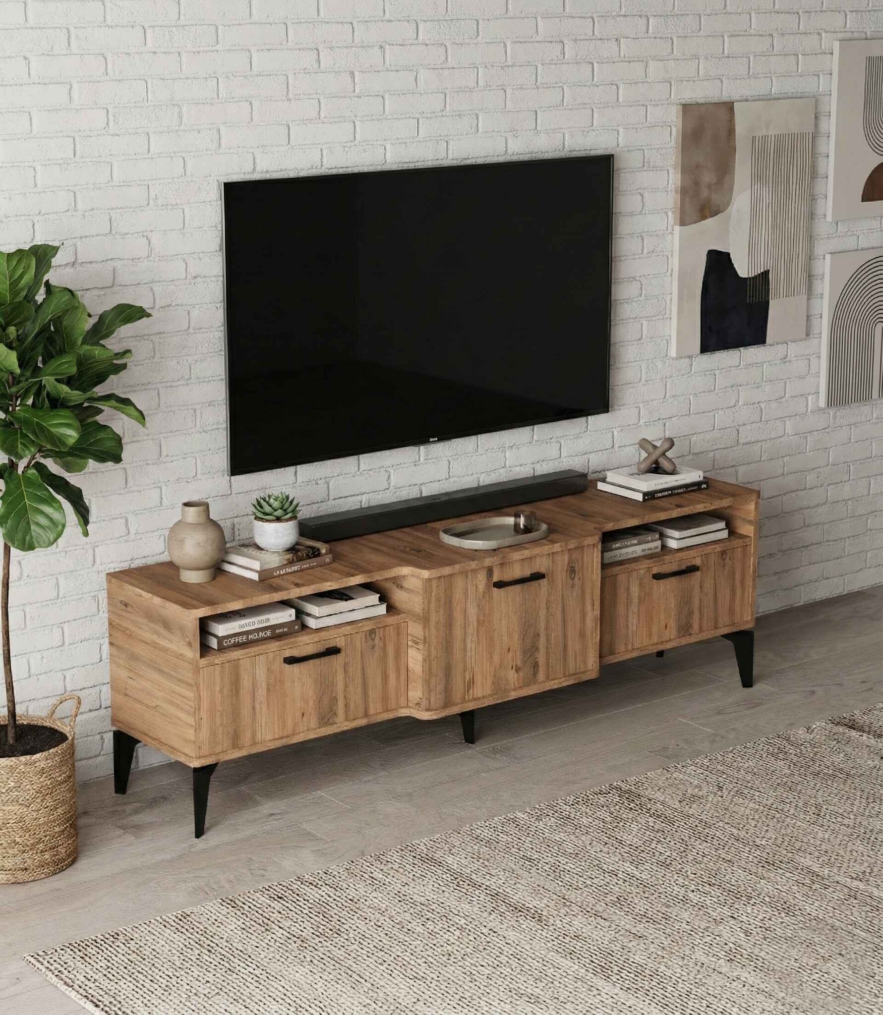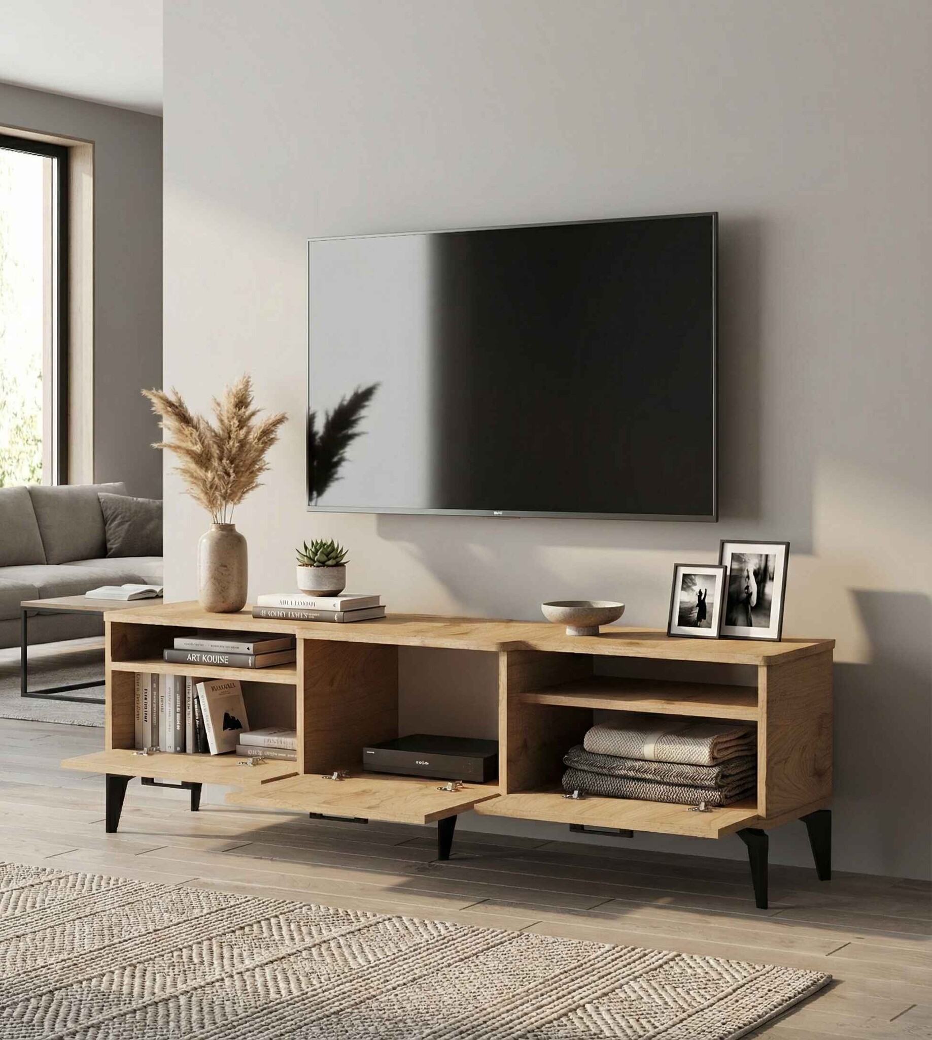 Geniş üst tabla, çeşitli boyutlardaki televizyonlar için ideal bir kullanım alanı sağlarken alt bölümde yer kapaklı raflar ise uydu alıcısı, kitap, dekoratif obje ve diğer elektronik cihazlar için pratik bir depolama çözümü sunar.