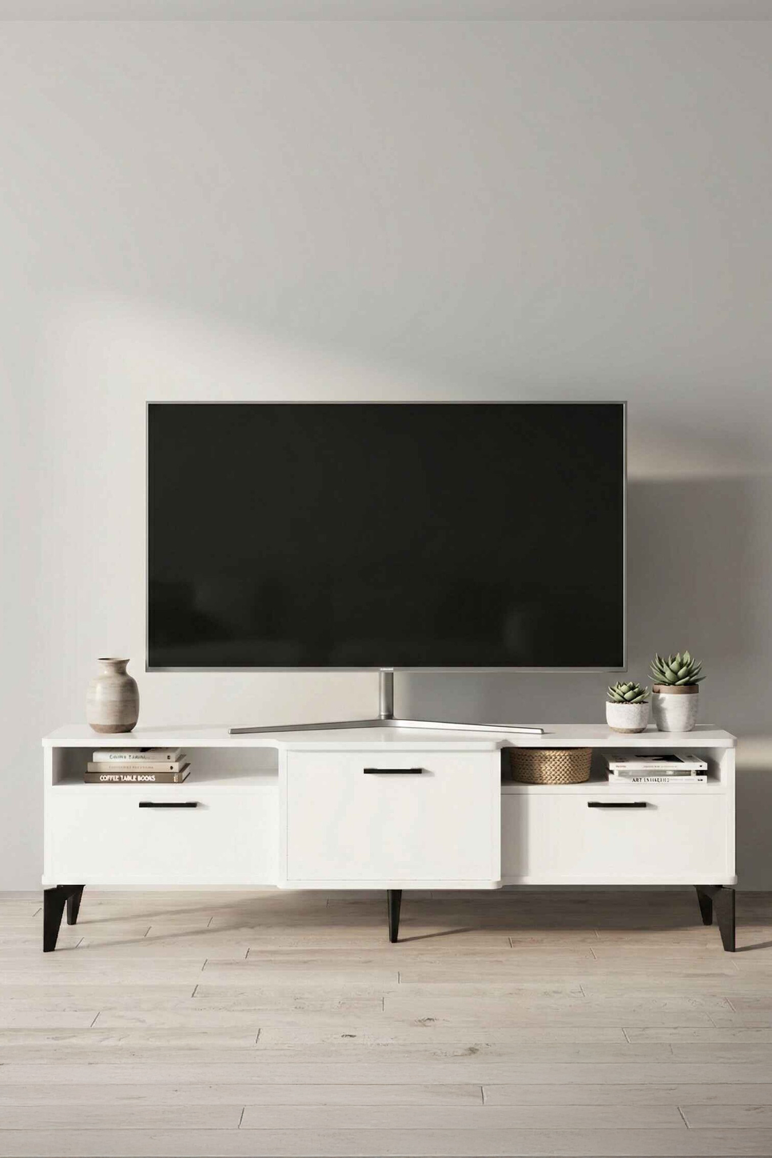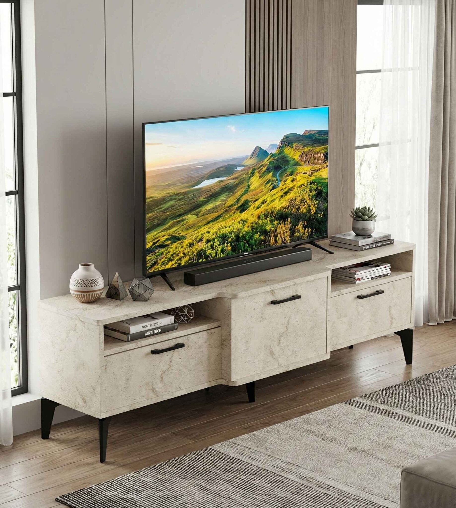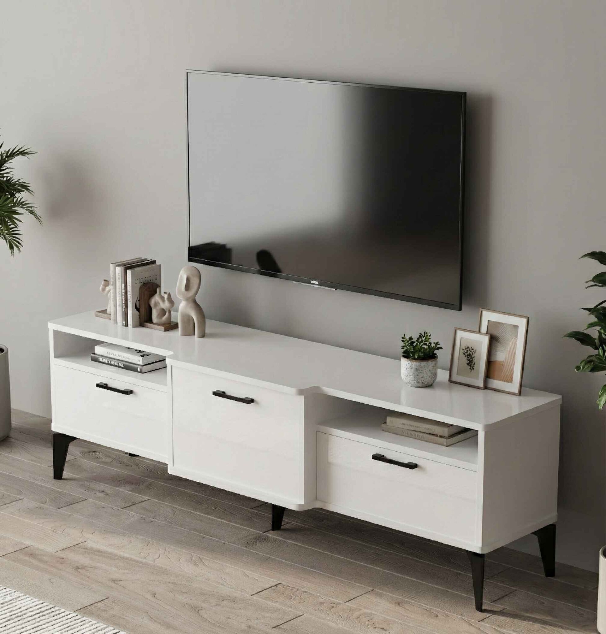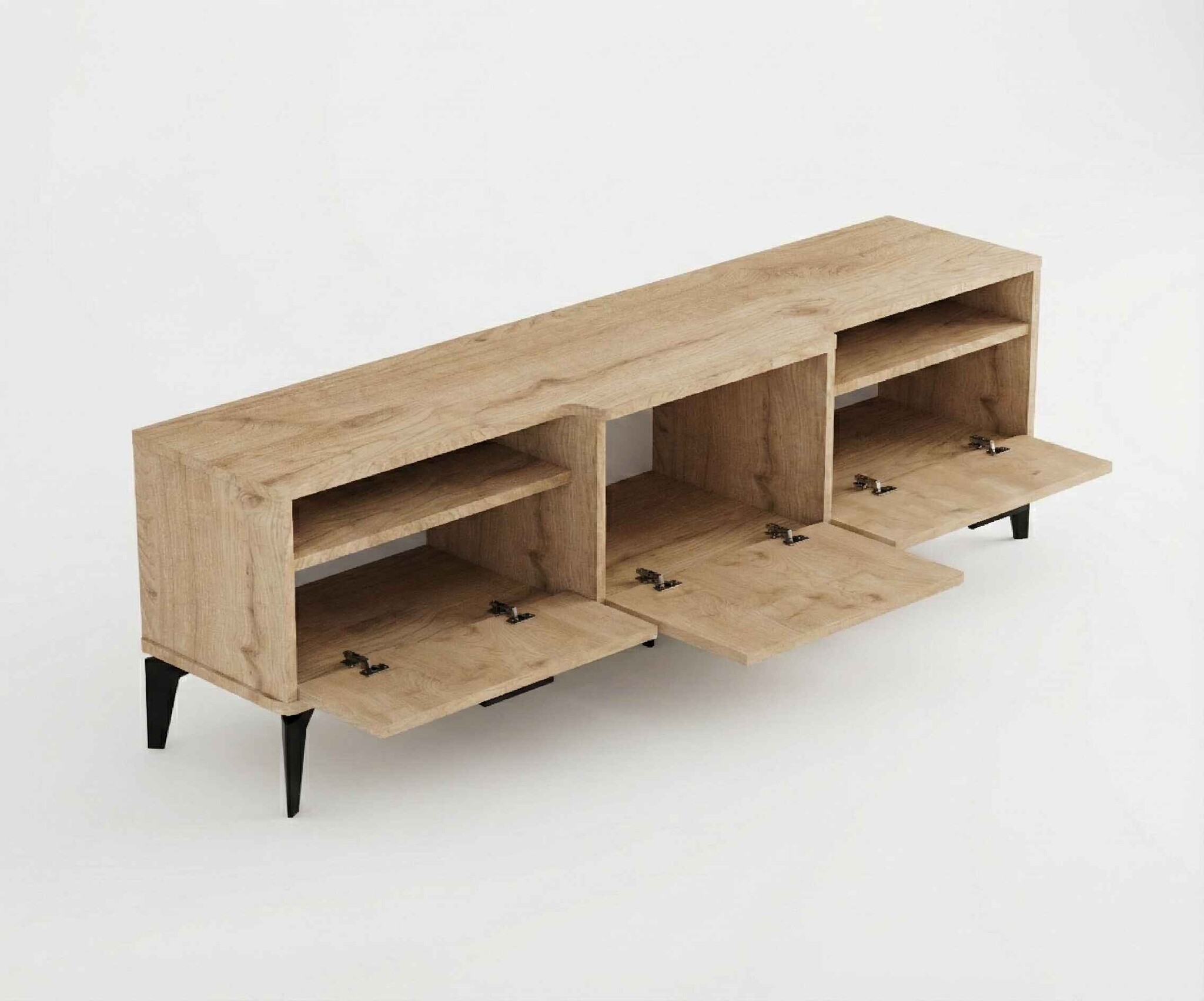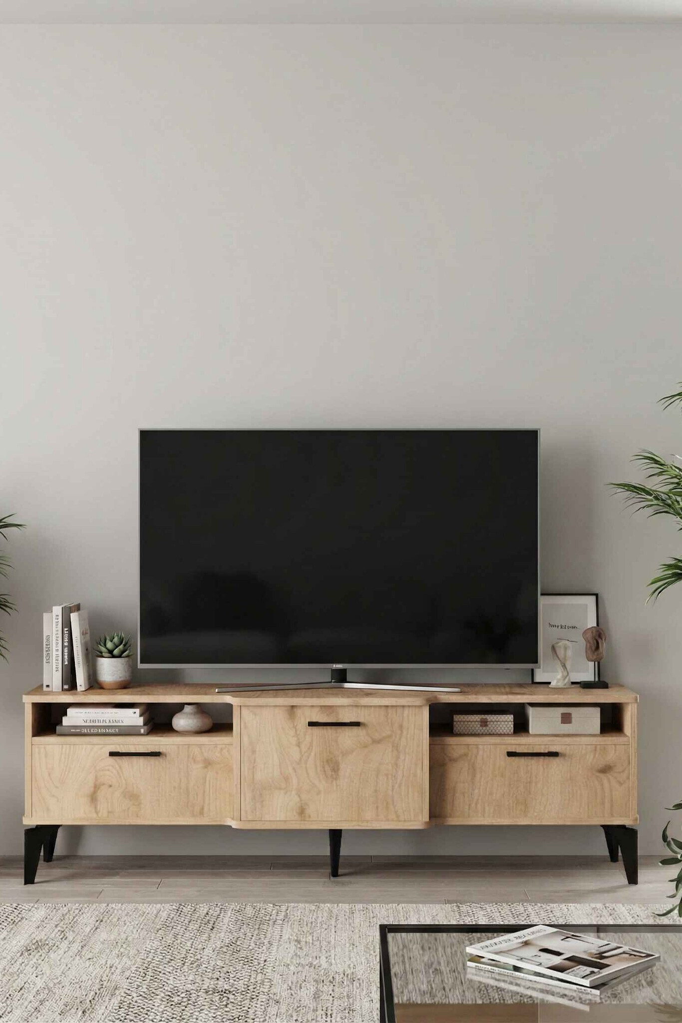 Geniş üst tabla, çeşitli boyutlardaki televizyonlar için ideal bir kullanım alanı sağlarken alt bölümde yer kapaklı raflar ise uydu alıcısı, kitap, dekoratif obje ve diğer elektronik cihazlar için pratik bir depolama çözümü sunar.