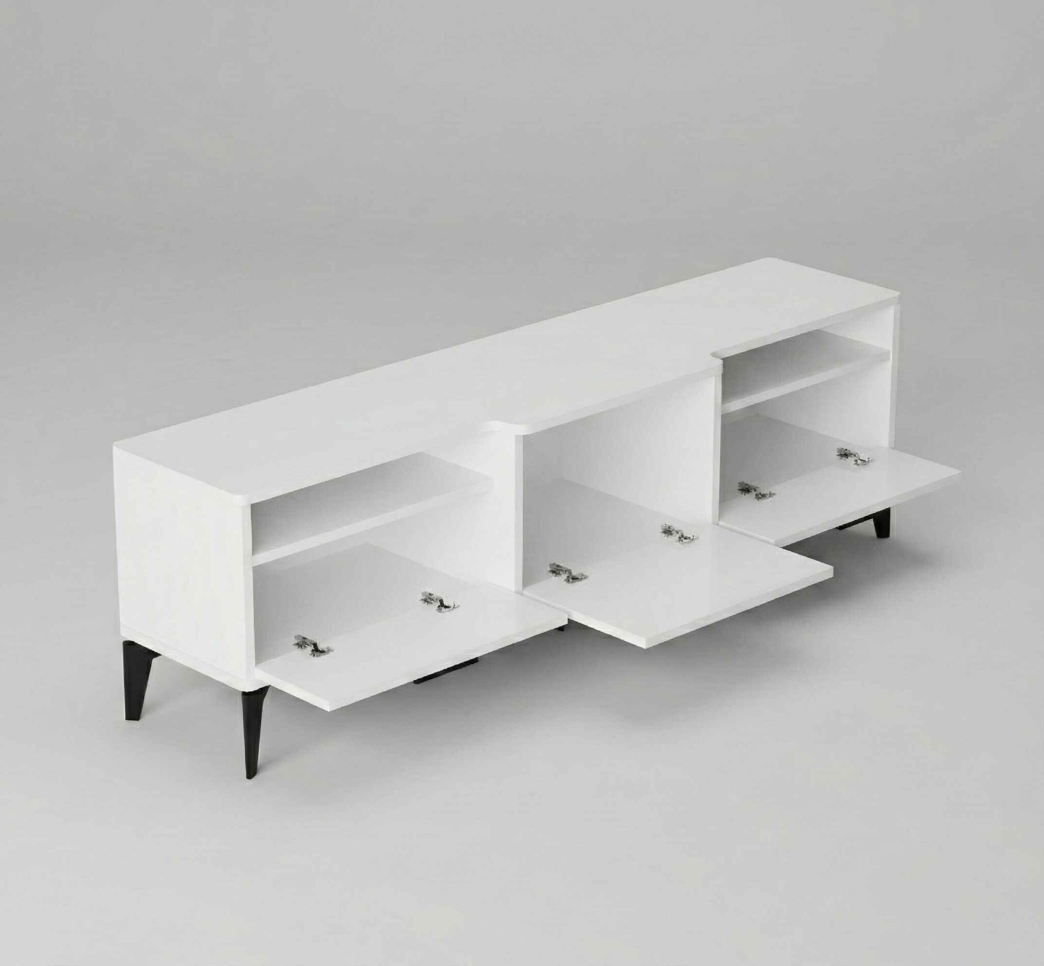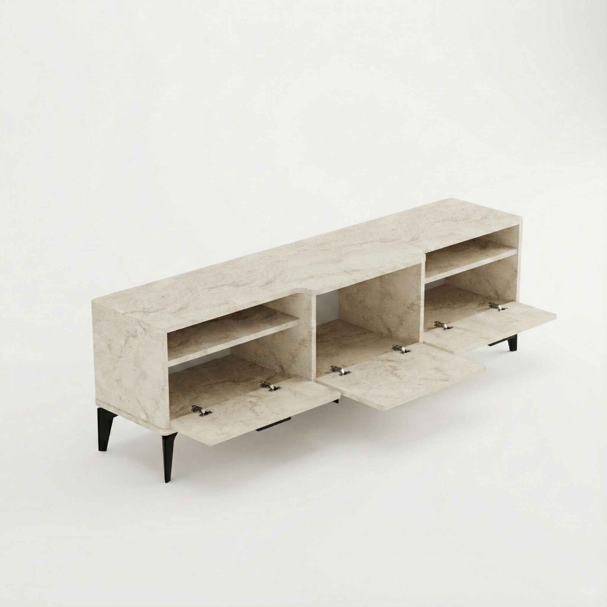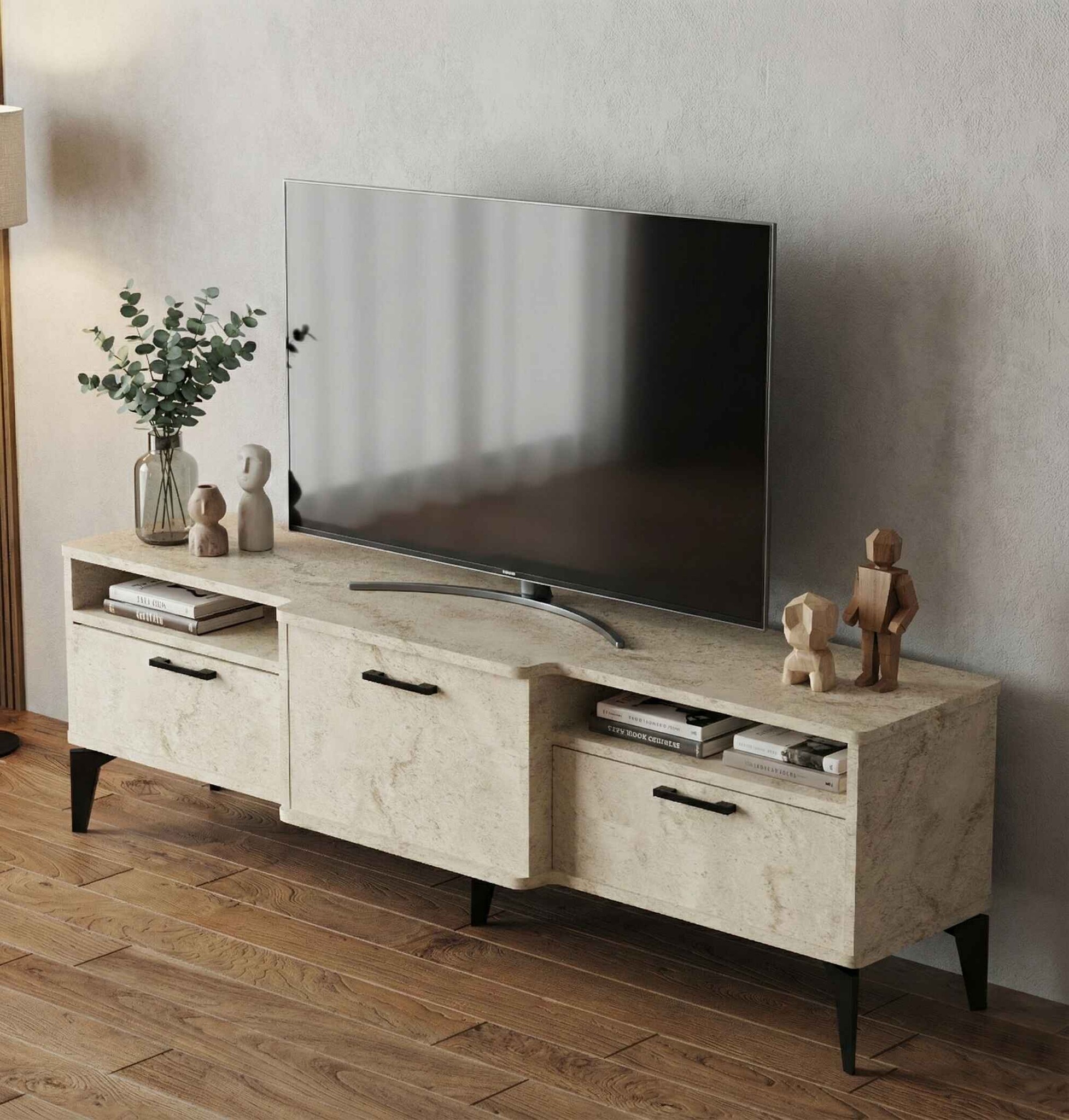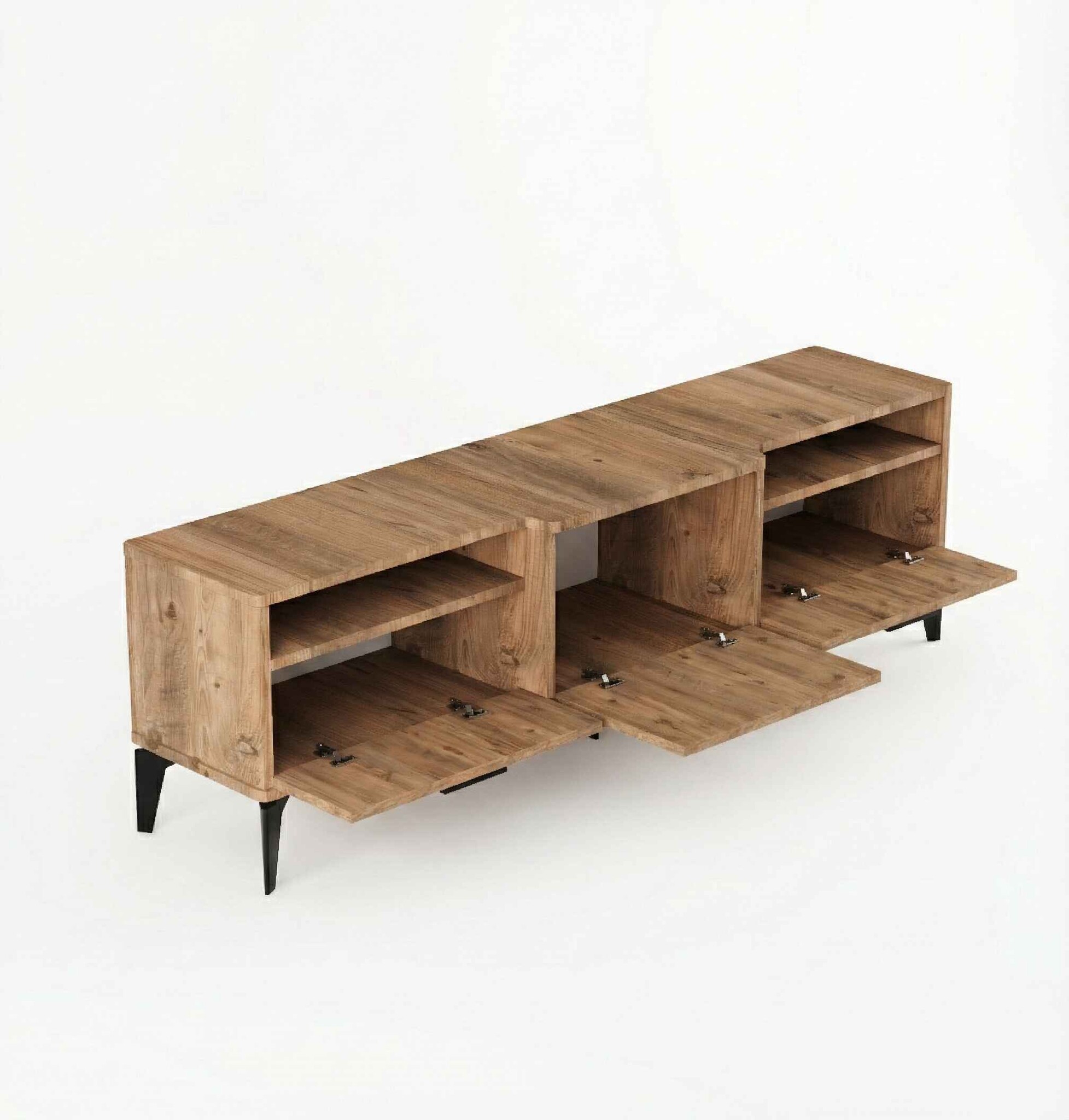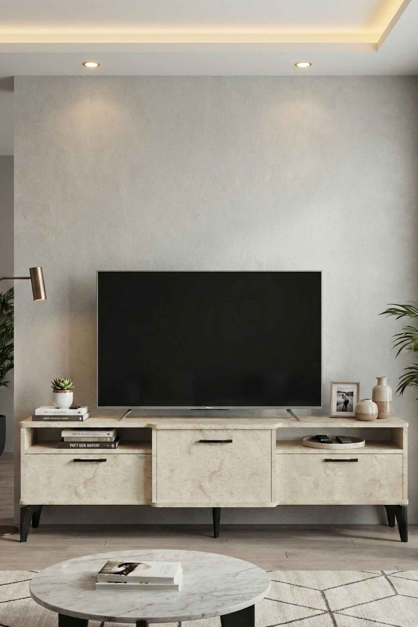 Geniş üst tabla, çeşitli boyutlardaki televizyonlar için ideal bir kullanım alanı sağlarken alt bölümde yer kapaklı raflar ise uydu alıcısı, kitap, dekoratif obje ve diğer elektronik cihazlar için pratik bir depolama çözümü sunar.